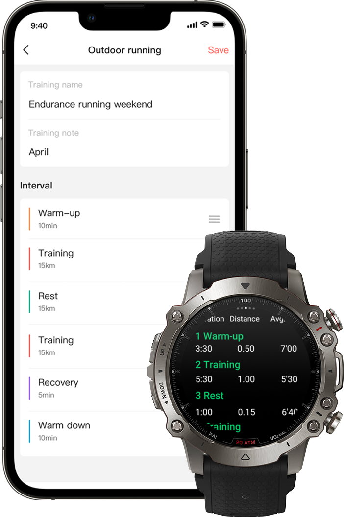 Divide templates into Warm Up, Training, Rest, Recovery, and Warm Down stages.Stages can be repeated up to 30 times per template.Set the watch to send reminders or automatically change