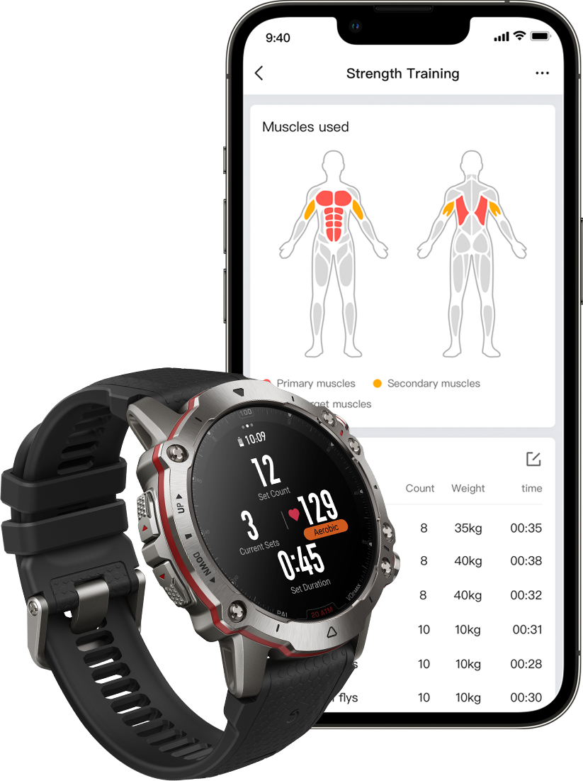 4. Smart recognition of strength training exercises can only be engaged within the Strength Training sports mode, and it supports recognition of:Bodyweight squats, Bodyweight straight arm front squats,Barbell squats, Tricep pushdowns, Bent over rows, Barbell bench press, Sit-up holds, Knee-touchsit-ups, Dumbbell flys, Burpees, Burpee jumps, Overhead tricep extensions, Lying tricep extensions,Lateral raises, Jumping jacks, Lat pulldowns, Deadlift, Push-up, Shoulder press, Pull up, Bicepcurls, Seated cable rows, Dumbbell drag curls, Straight-arm pulldowns, Russian twists. If anexercise is not auto-recognized by watch, the Zepp App can provide a list of muscle groups orexercise names to choose from.
