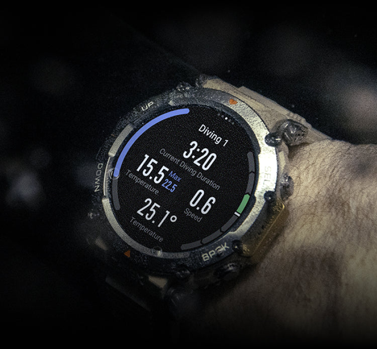 Go freediving up to 30 meters10 with the Amazfit T-Rex Ultra. The ultra-bright AMOLED display keeps key information like depth and water temperature easily visible, even underwater.