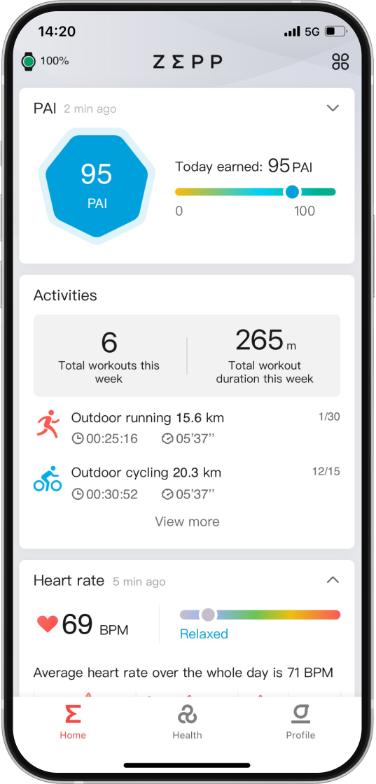 The power-efficient and health-centered Zepp OS works with the advanced BioTracker™ PPG sensor to enable 24/7 monitoring20 of heart rate, blood-oxygen and stress levels. With just a single tap, you can even test21 these three metrics, as well as breathing rate, simultaneously.