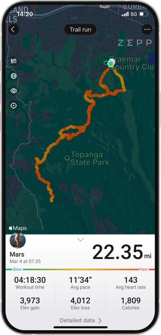 Download an offline map5 from the Zepp App to the watch, and your position on the map will update in real-time as you navigate with a matching route file.
