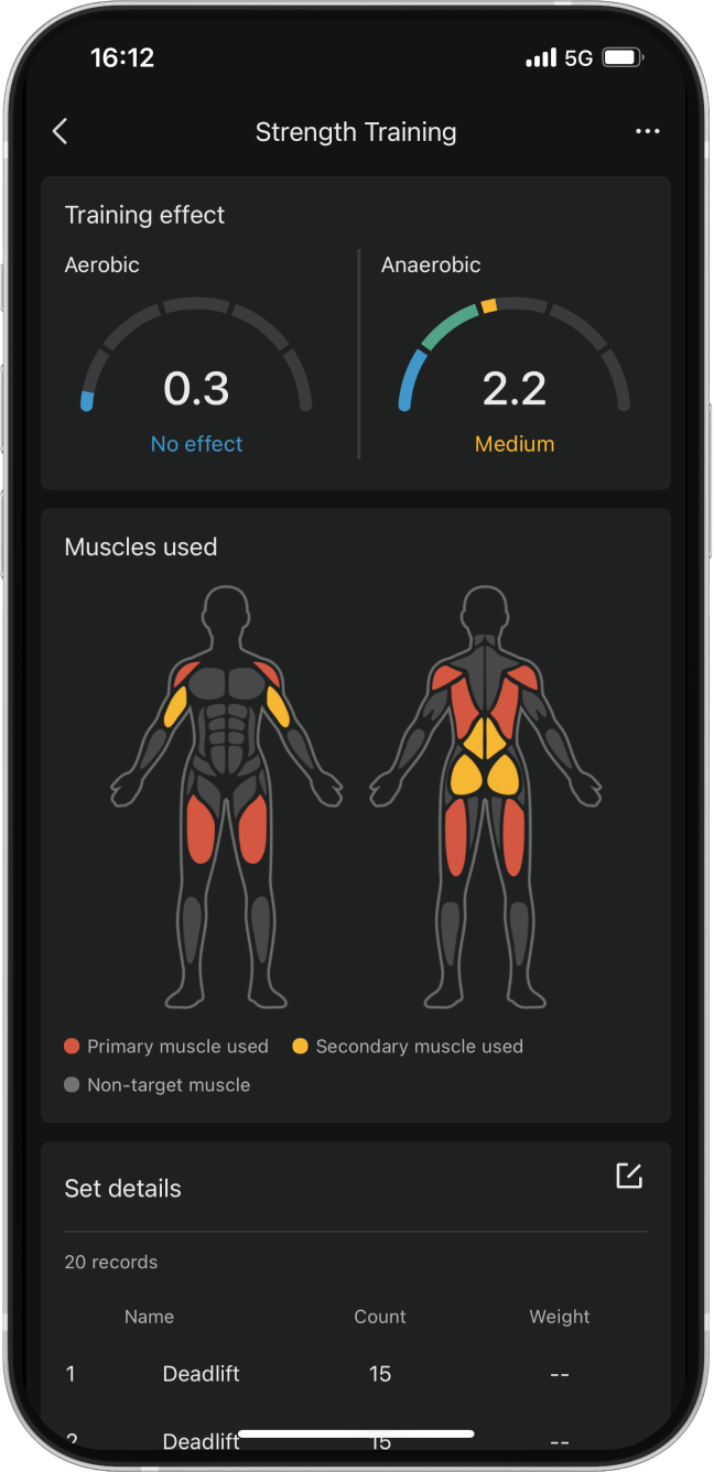 After your workout, the Zepp App will display your performed exercises and which muscle groups you hit. You can even store the names of up to 100 of your own variations for personalized training logs.